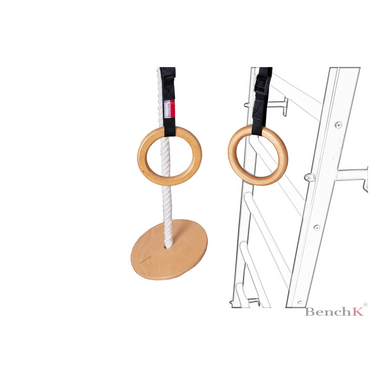 The A076 Gymnastic Accessories are a great addition to BenchK wall bars. This accessory set includes a pair of gymnastic rings and a climbing rope with a wooden swing.