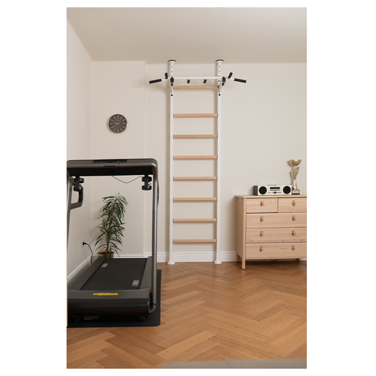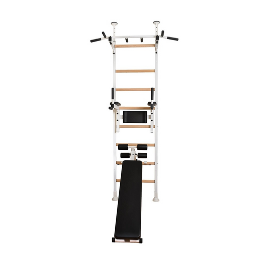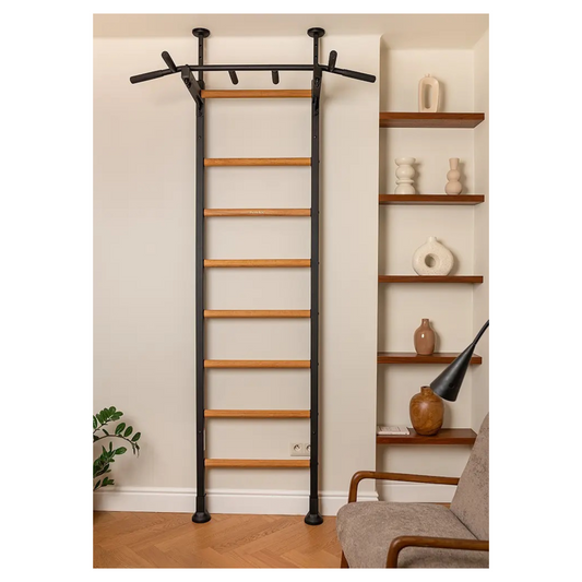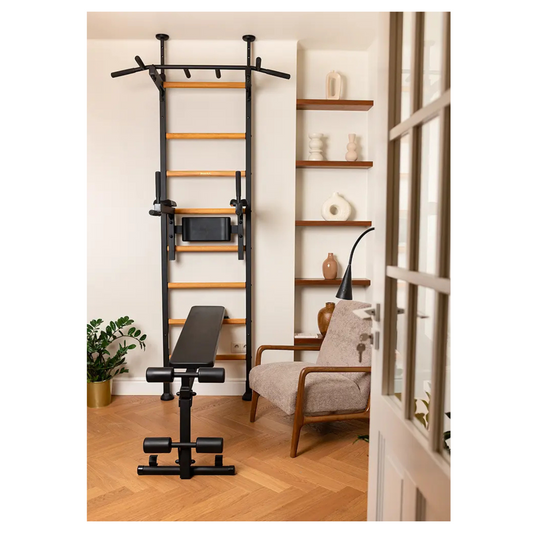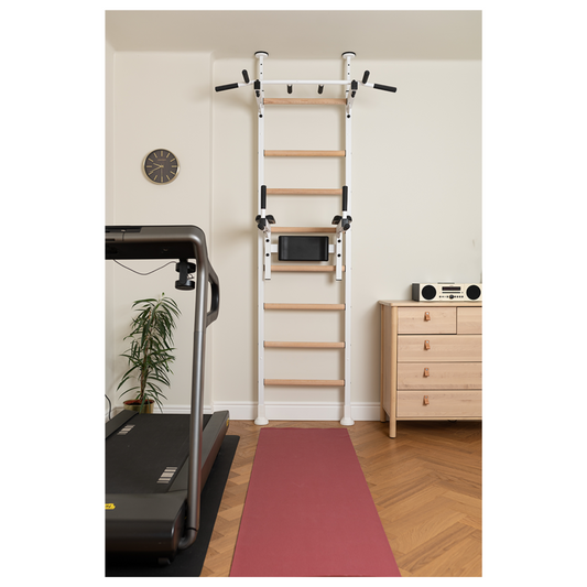 These wall bars are made from solid beech wood and steel, and are hand oiled with two layers of organic oil which has been approved for contact with food. With Series 5, you can do mobility work and various stretches with or without the use of bands, or can attach straps for more exercise options. You can also opt for a model that comes with additional equipment such as a dip bar and workout bench.