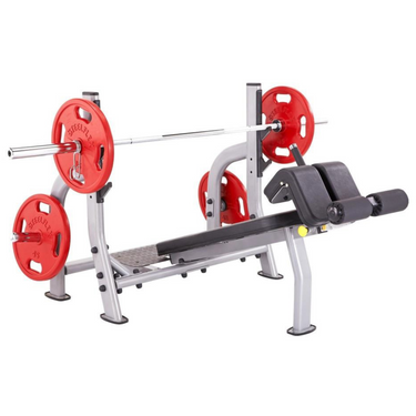 The Steelflex Olympic Decline Bench is a commercial grade bench built for performance and comfort. Its ergonomic design, adjustable leg rest, and strong construction make it ideal for serious strength training. Designed with heavy-gauge oval tubing and convenient plate storage, this bench delivers both stability and function. It's the perfect bench for working the lower chest muscles.