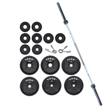 The York Barbell 300 lb 2" Cast Iron Olympic Weight Plate Set combines the classic "meat and potatoes" of the York line with a high-quality steel barbell. This weight set is not only budget friendly but also a classic combination. Perfect for an in-home gym or for the commercial setting.