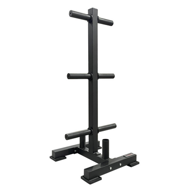 The Olympic Weight Plate Tree for Bumper Plates keeps weights elevated off the floor, preventing tripping hazards and allowing for easy plate changes. It can accommodate all sizes of bumper plates and also features storage for barbells.