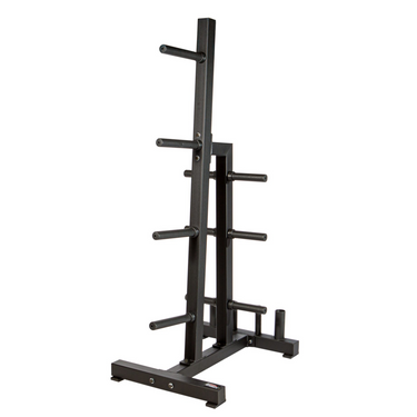 The York Barbell Single Sided Weight Plate Tree maximizes plate storage and is designed to hold large quantities of weights without taking up too much floor space. The front four storage pegs measure 12 ¾” in length, providing ample space for Olympic or bumper plates. An additional six side pegs, each 8 ¼” long, offer extra storage for more plates. The rear of the unit includes two Olympic barbell holders and Olympic collar storage pegs, making this an all-in-one storage rack.