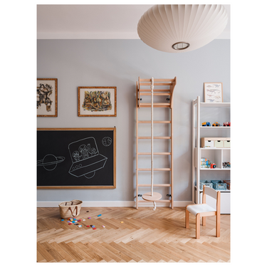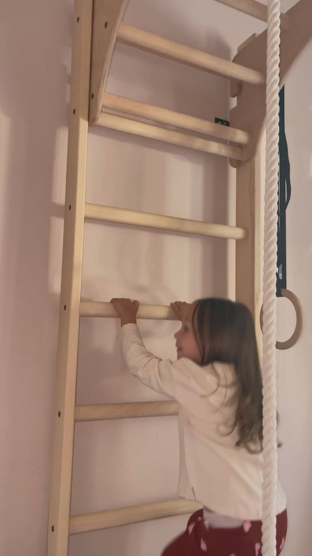 Includes: Wall bars (gymnastic ladder), adjustable wooden pull-up bar, gymnastic rings, climbing rope with a swing