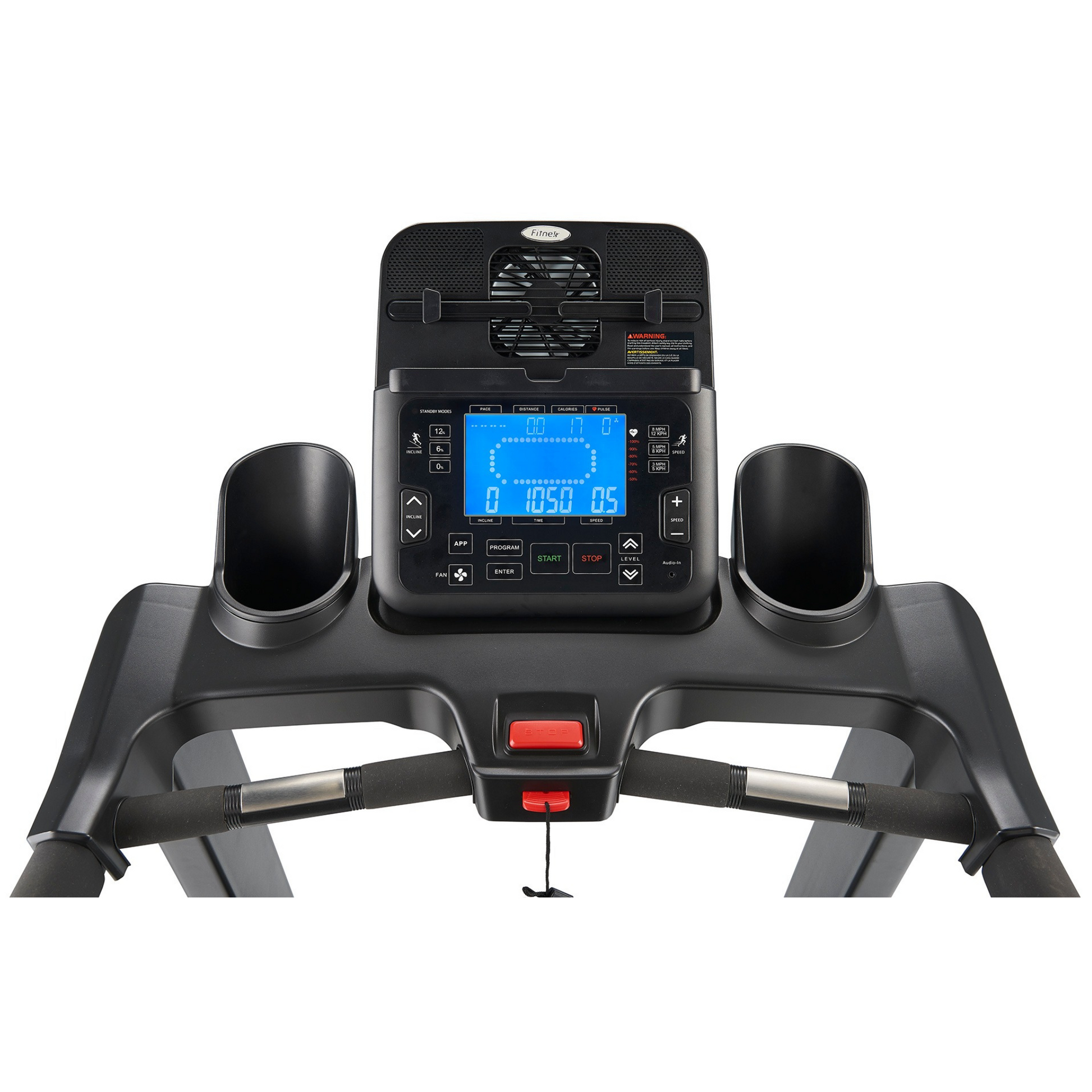 For added convenience, the treadmill features a two-speed adjustable fan, dual water bottle holders, an adjustable book/magazine rack, built-in speakers, and a USB charging port, making it both practical and versatile for light commercial settings such as apartment, hotel, and condo gyms, personal training facilities and more.