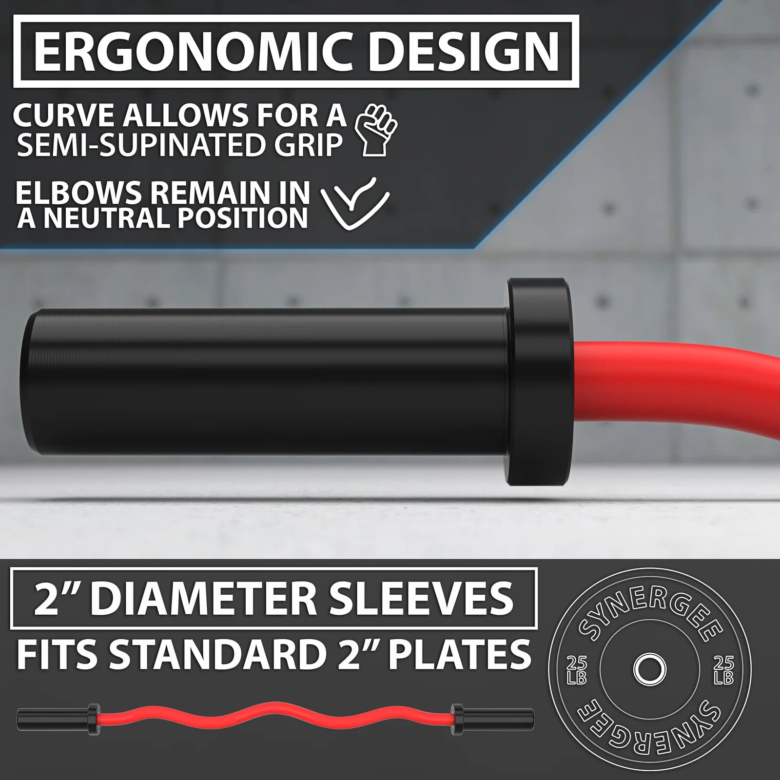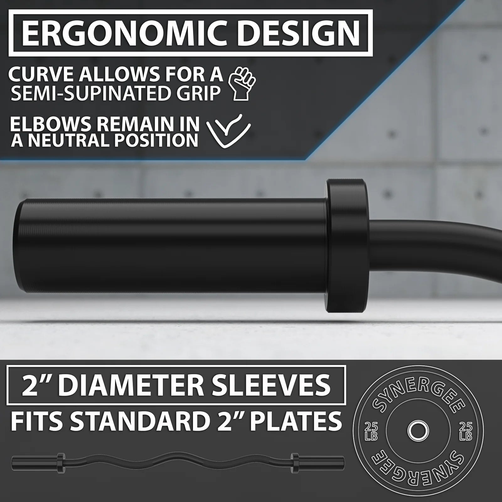 Synergee designed this bar with you in mind. The curves let you perform more reps with less strain on your wrists—because less risk of injury means more room for gains! The design keeps your wrists and elbows in a more natural position during curls, rows, or skull crushers, while directly engaging your upper arm and forearm muscles.