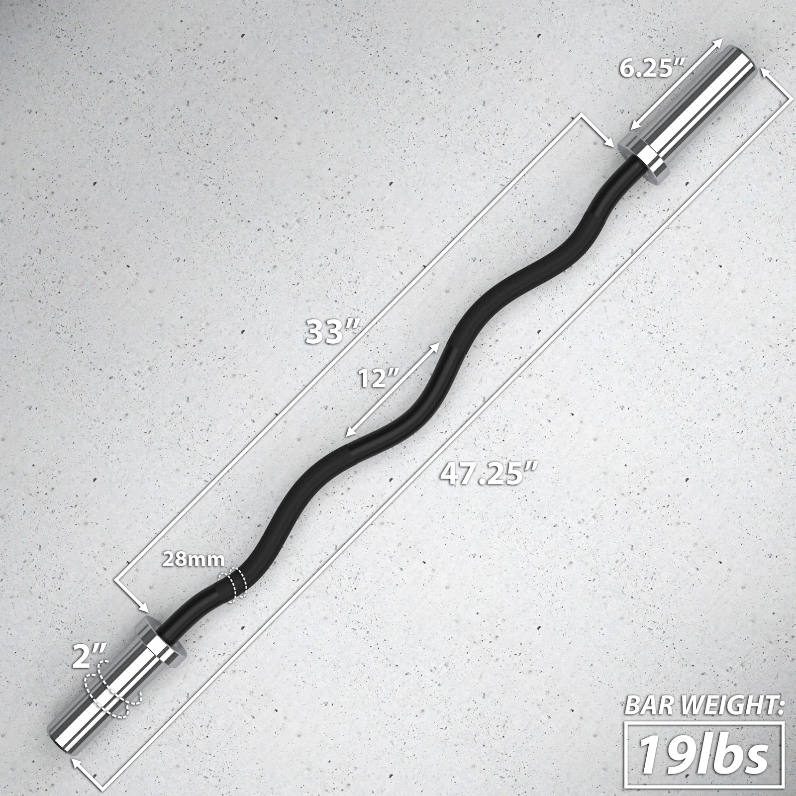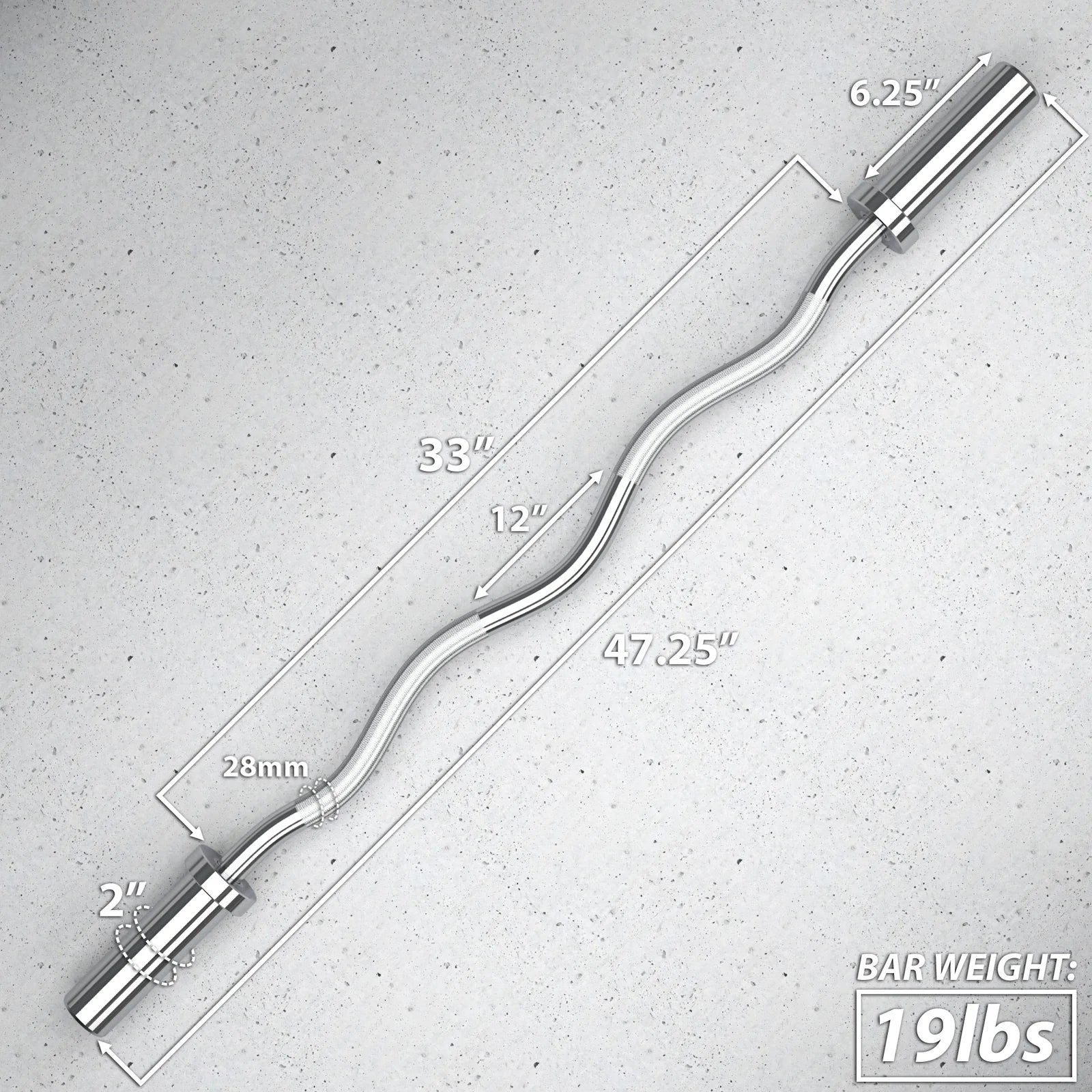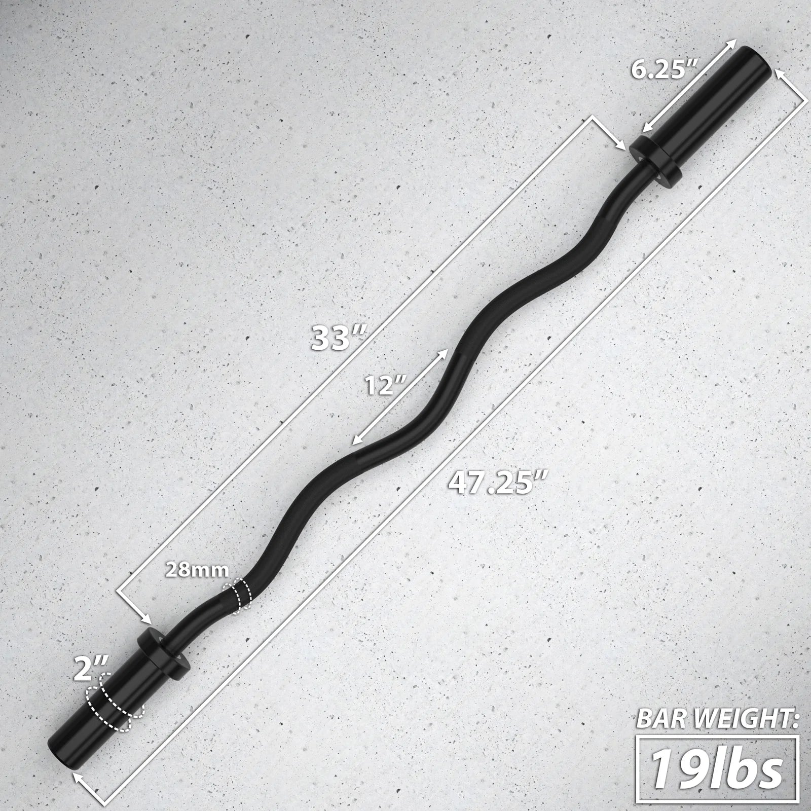 Choose between the four options for your steel EZ Curl Bar. Each bar is 19 lbs, 47.25" long, 28 mm in diameter, and has 6.25" of loadable sleeve length on either side.