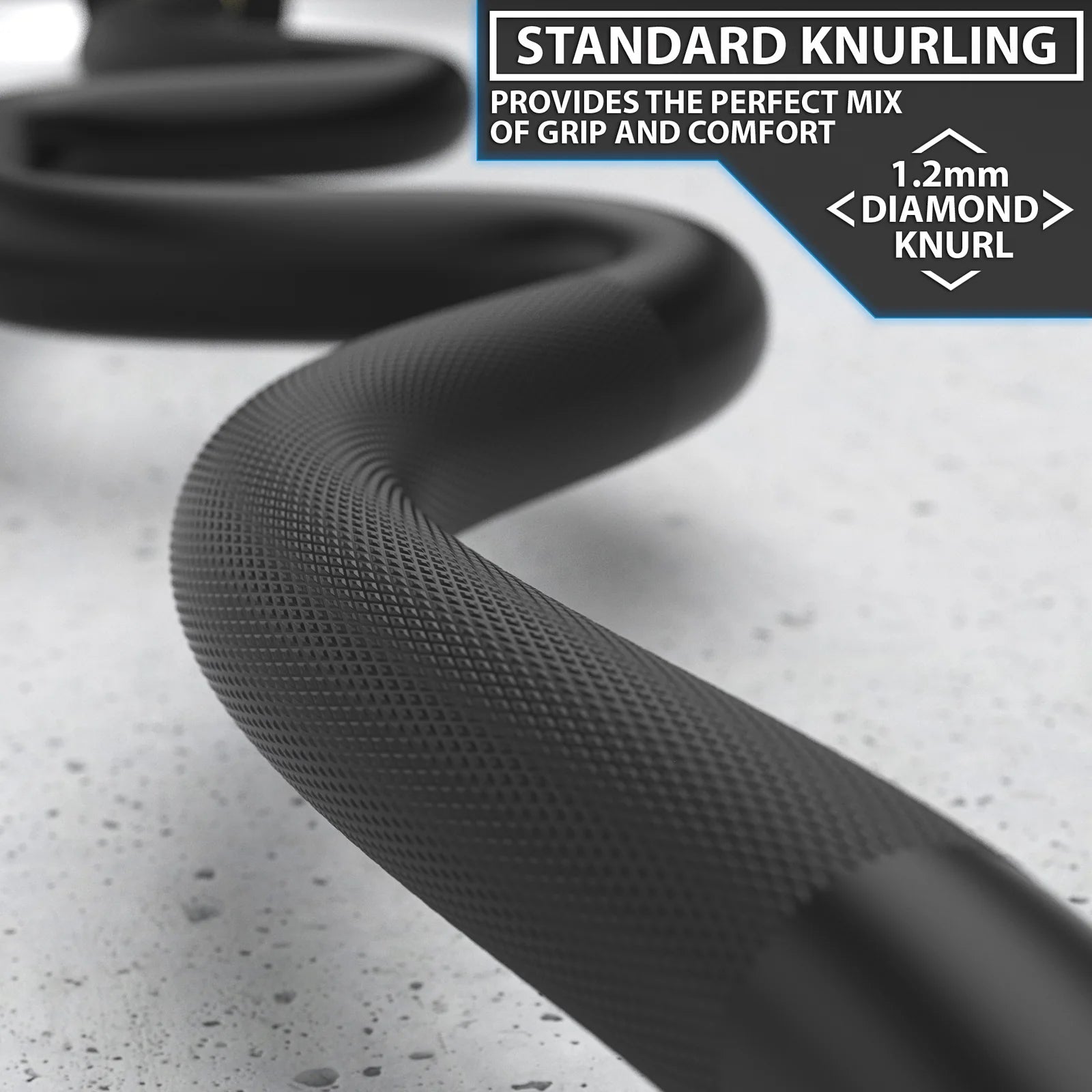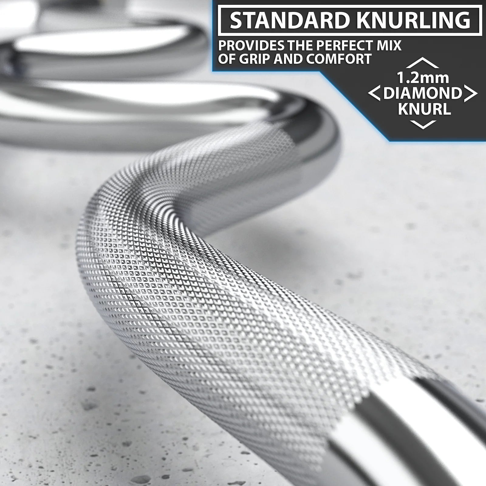 The Super Curl Bar has more aggressive angles than their EZ Curl Bar, with all the same high-quality materials and attention to design and details. It has a 400 lb weight capacity and features standard knurling for a secure grip. The sleeves provide ample loadable space and are compatible with 2" weight plates.