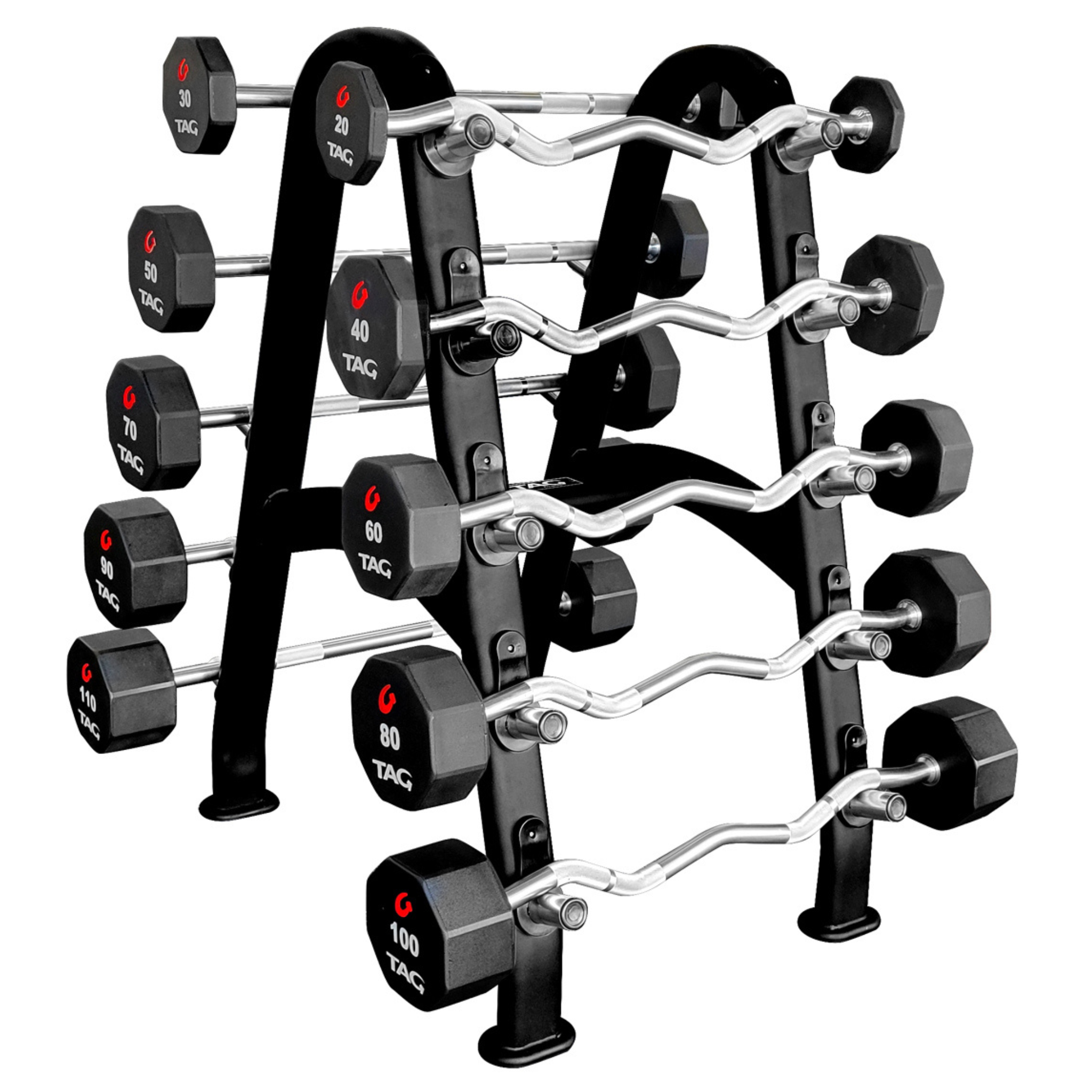 Use: Holds a complete set of 20–110 lb fixed barbells.