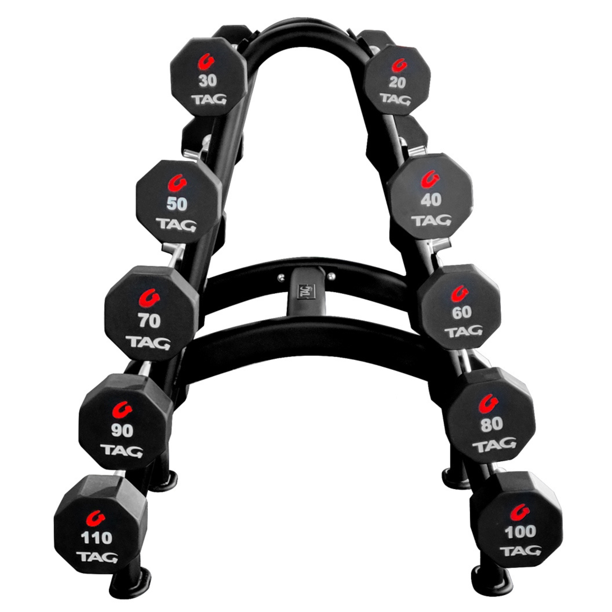 The TAG Fitness 10-Unit Barbell Rack offers an organized storage solution for fixed barbells. Built from heavy-gauge steel with a powder-coated finish, this rack securely holds a full set of 20–110 lb fixed barbells while saving valuable floor space.