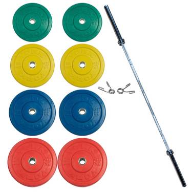 The York Barbell Rubber Training Bumper Plate Set (Color, Metric) is a great addition to any gym. 160 kgs total, it comes with a range of York Barbell Rubber Training Bumper Plates (Color, Metric), a YORK® International Olympic Training Bar, and a pair of Olympic Spring Collars.